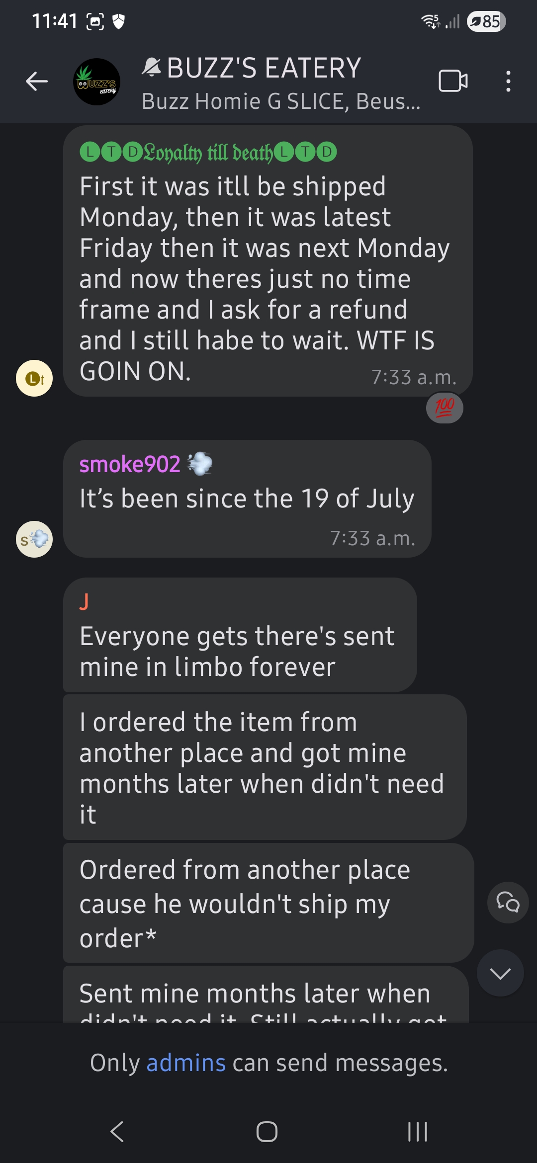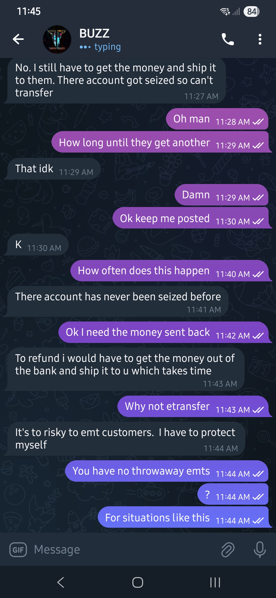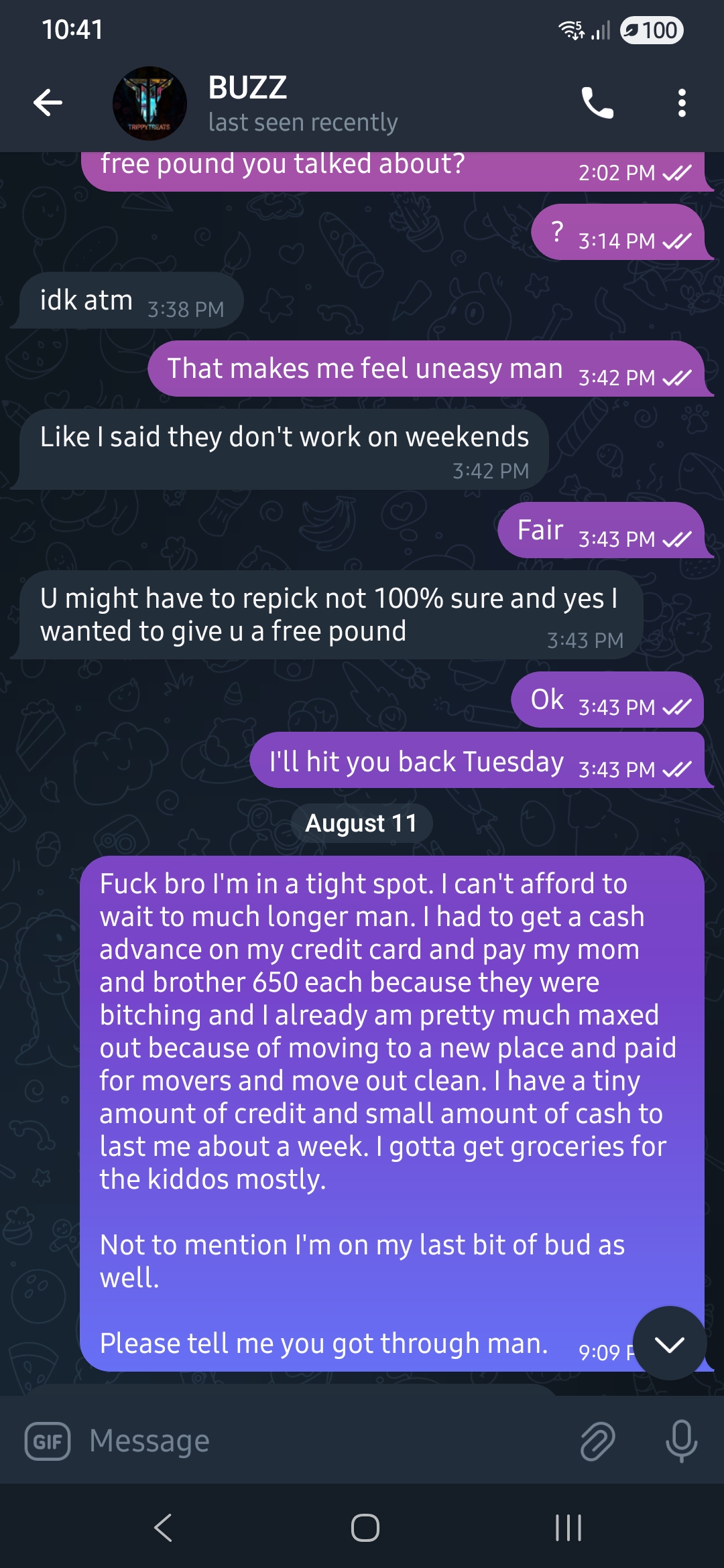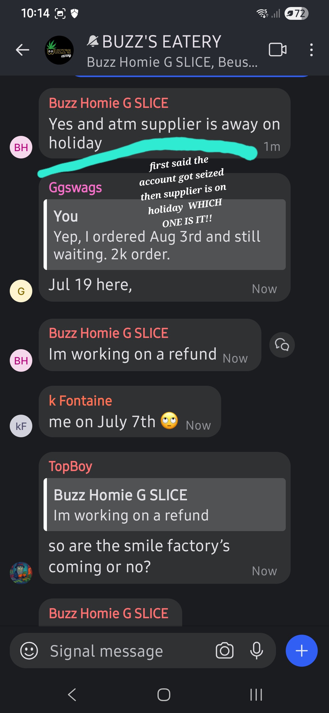 Ordered from Buzz's Eatery/TrippyTreats.net on August 3rd. $1950 for wholesale flower. Buzz told me it would be shipped within a few days. Few days past and then he said somethings up he needs more time. Said by the next week it should be shipped. Nope not shipped no tracking. First time in 6 years this has happened so I'm being as patient as I can. Even though I just moved and was pretty much broke and still decided to pitch with my mom and brother on this order. I had to pay for movers and move out cleaning etc. Plus my mom and brother were tripping about the situation so I [b]TOOK OUT A CASH ADVANCE AND PAID THEM 650 EACH BACK[/b]. Meanwhile I asked for my money back and he said he couldn't send my money back. [b]HOW CAN YOU NOT SEND THE MONEY BACK I JUST SENT YOU THATS BAD BUSINESS[/b]. Told him I would order again when things are clear. Nope can get my fucking money back. Now I don't like exposing myself like this but I have kids and responsibilities and [b]HAD NO MONEY TO GET GROCERIES. KIDS HAD TO GO WITH MY S.O.'s GRANDPARENTS[/b]. My family is absolutely pissed at me and me at myself for letting this happen. Not only that other people have been waiting on orders, and some since June! We calculated about $11,000 worth of orders we know between the few of us and thats just the ones we know of, I'm sure there's more. Buzz knew he had issues before my order and people waiting [b]BUT STILL TOOK MY MONEY THEN REFUSED TO REFUND ME[/b] and lied about it. Absolutely wild. Bad business acumen and straight up wrong. August 24th he says 100% he can get the order sent a day after he was supposed to refund me half of my money. I took his word believed the guy ffs(Idiot move). August 28th and still nothing. This guy is messing with people's money, family and lives. Used to trust Buzz but now I don't. First Buzz said the account he transfers to got seized. Then Buzz said the supplier is on holiday. One account defending Buzz said the suppliers mom is in hospital. [b]BUNCH OF EXCUSES[/b]. Screenshots as receipts attached. I want my money back. Buzz you have lost a lot of trust from people now. Mind you this is after about 6 years of business with Buzz who has always been a good dude to me and I remained loyal to him [b]BECAUSE[/b] he was a good dude. Definitely spent about 40k atleast over those years, maybe more pitching in together with my family. I don't know what has changed recently and why he's lying and not being honest and transparent. Quite the way to ruin a once good friendship.Aug 30, 2025