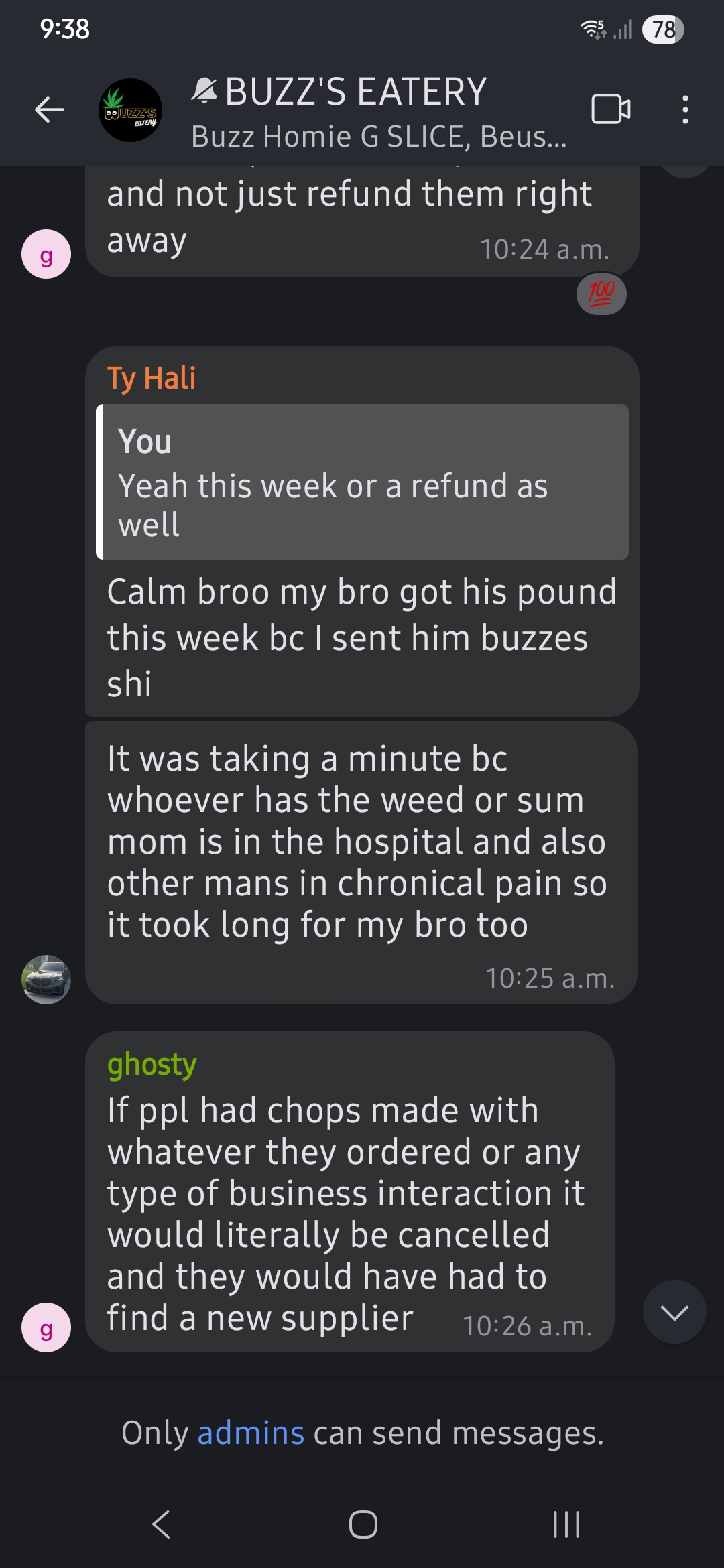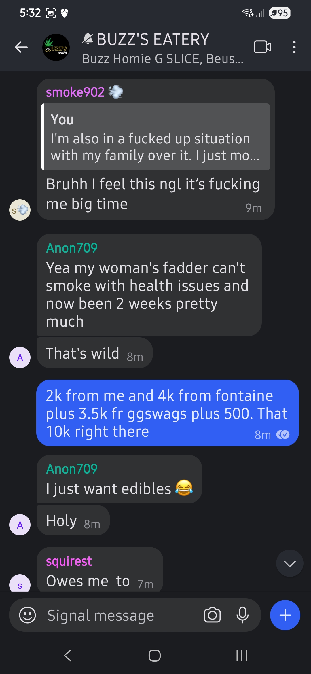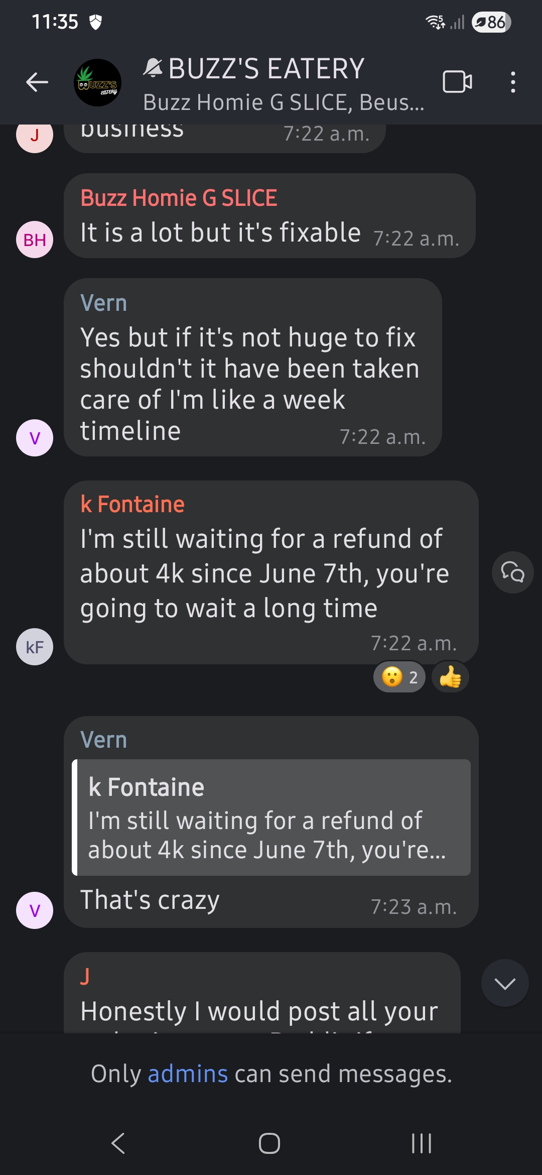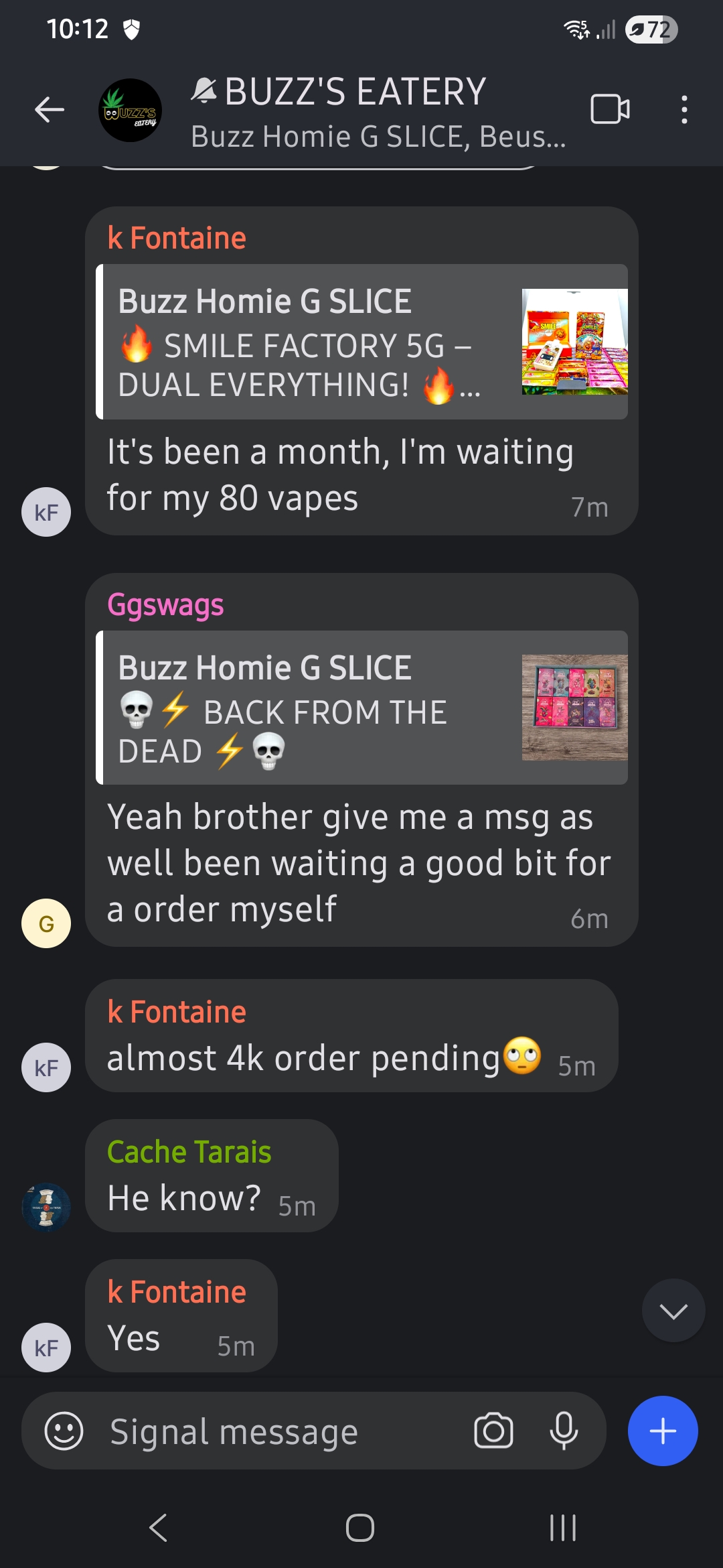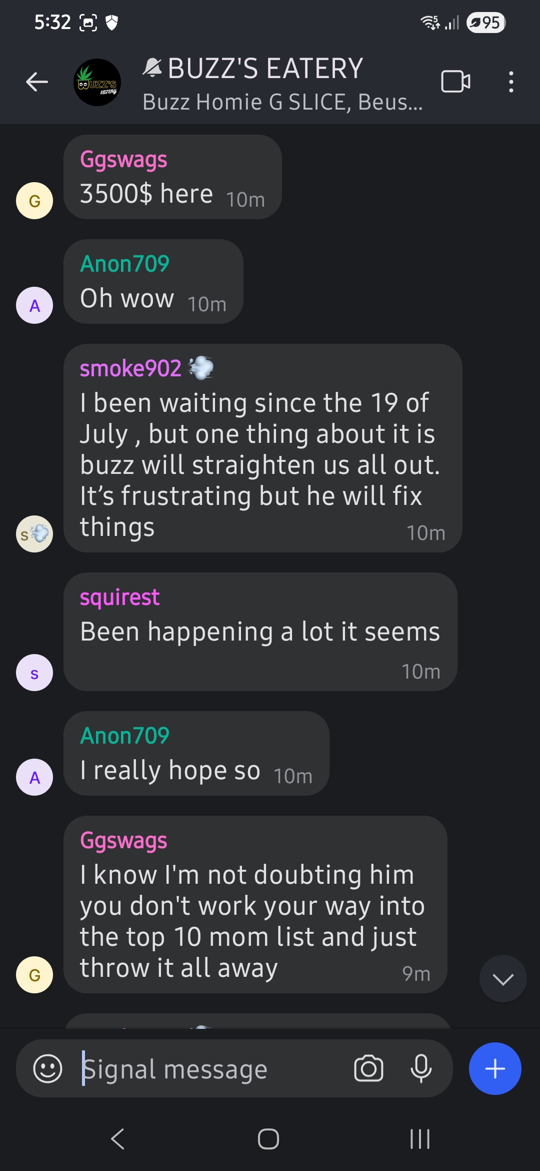 Ordered from Buzz's Eatery/TrippyTreats.net on August 3rd. $1950 for wholesale flower. Buzz told me it would be shipped within a few days. Few days past and then he said somethings up he needs more time. Said by the next week it should be shipped. Nope not shipped no tracking. First time in 6 years this has happened so I'm being as patient as I can. Even though I just moved and was pretty much broke and still decided to pitch with my mom and brother on this order. I had to pay for movers and move out cleaning etc. Plus my mom and brother were tripping about the situation so I [b]TOOK OUT A CASH ADVANCE AND PAID THEM 650 EACH BACK[/b]. Meanwhile I asked for my money back and he said he couldn't send my money back. [b]HOW CAN YOU NOT SEND THE MONEY BACK I JUST SENT YOU THATS BAD BUSINESS[/b]. Told him I would order again when things are clear. Nope can get my fucking money back. Now I don't like exposing myself like this but I have kids and responsibilities and [b]HAD NO MONEY TO GET GROCERIES. KIDS HAD TO GO WITH MY S.O.'s GRANDPARENTS[/b]. My family is absolutely pissed at me and me at myself for letting this happen. Not only that other people have been waiting on orders, and some since June! We calculated about $11,000 worth of orders we know between the few of us and thats just the ones we know of, I'm sure there's more. Buzz knew he had issues before my order and people waiting [b]BUT STILL TOOK MY MONEY THEN REFUSED TO REFUND ME[/b] and lied about it. Absolutely wild. Bad business acumen and straight up wrong. August 24th he says 100% he can get the order sent a day after he was supposed to refund me half of my money. I took his word believed the guy ffs(Idiot move). August 28th and still nothing. This guy is messing with people's money, family and lives. Used to trust Buzz but now I don't. First Buzz said the account he transfers to got seized. Then Buzz said the supplier is on holiday. One account defending Buzz said the suppliers mom is in hospital. [b]BUNCH OF EXCUSES[/b]. Screenshots as receipts attached. I want my money back. Buzz you have lost a lot of trust from people now. Mind you this is after about 6 years of business with Buzz who has always been a good dude to me and I remained loyal to him [b]BECAUSE[/b] he was a good dude. Definitely spent about 40k atleast over those years, maybe more pitching in together with my family. I don't know what has changed recently and why he's lying and not being honest and transparent. Quite the way to ruin a once good friendship.Aug 30, 2025